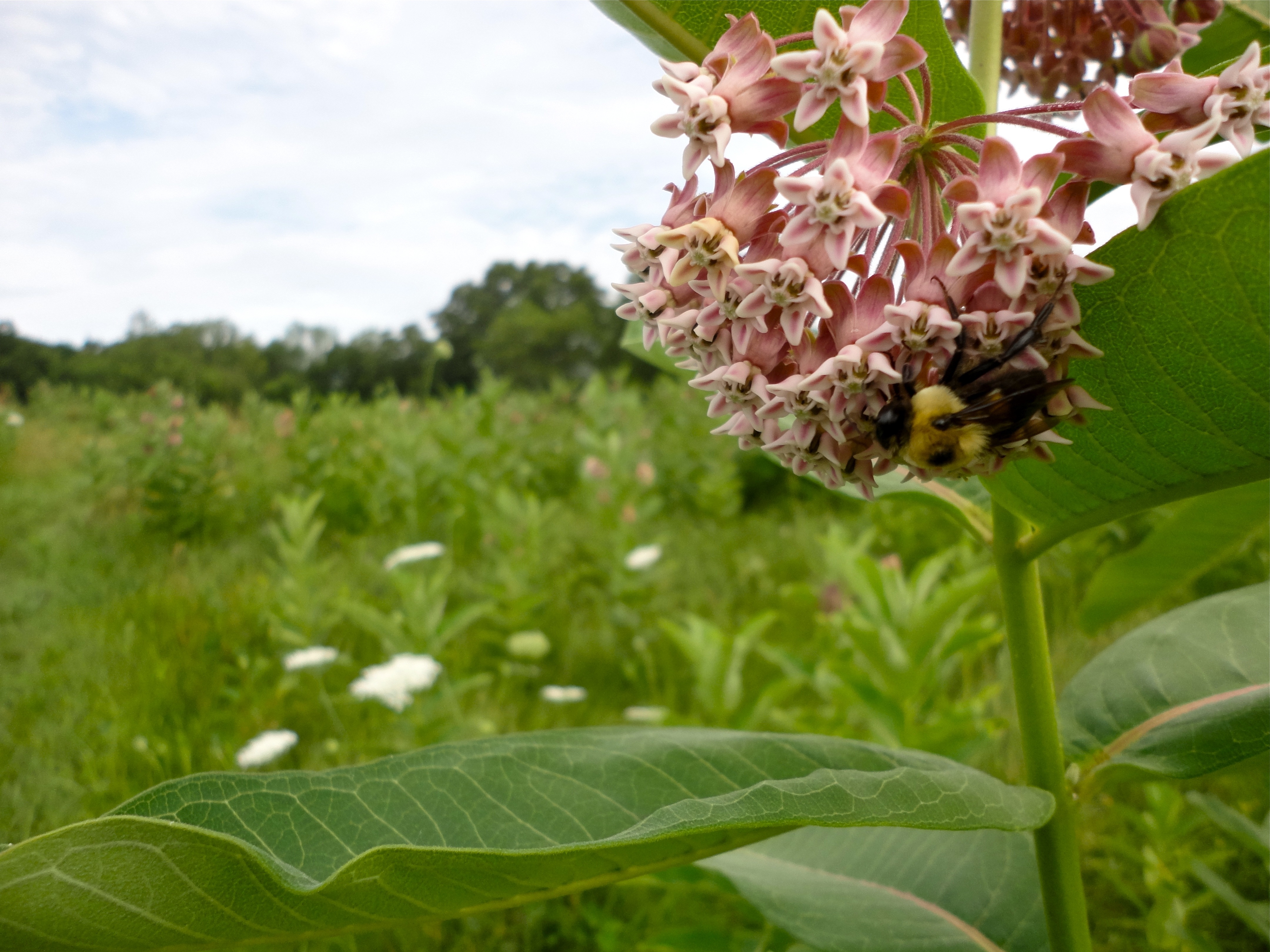 The nice part about working in a garden plot on a piece of conservation land is that there are lots of buzzing, happy hungry bees. There are wild bumblebees and domesticated honeybees from the bee boxes in the corner, and other flying creatures that are doing something right because my 3/4 of my tomato plants have tomatoes on them. I just never seem to catch them in my garden.