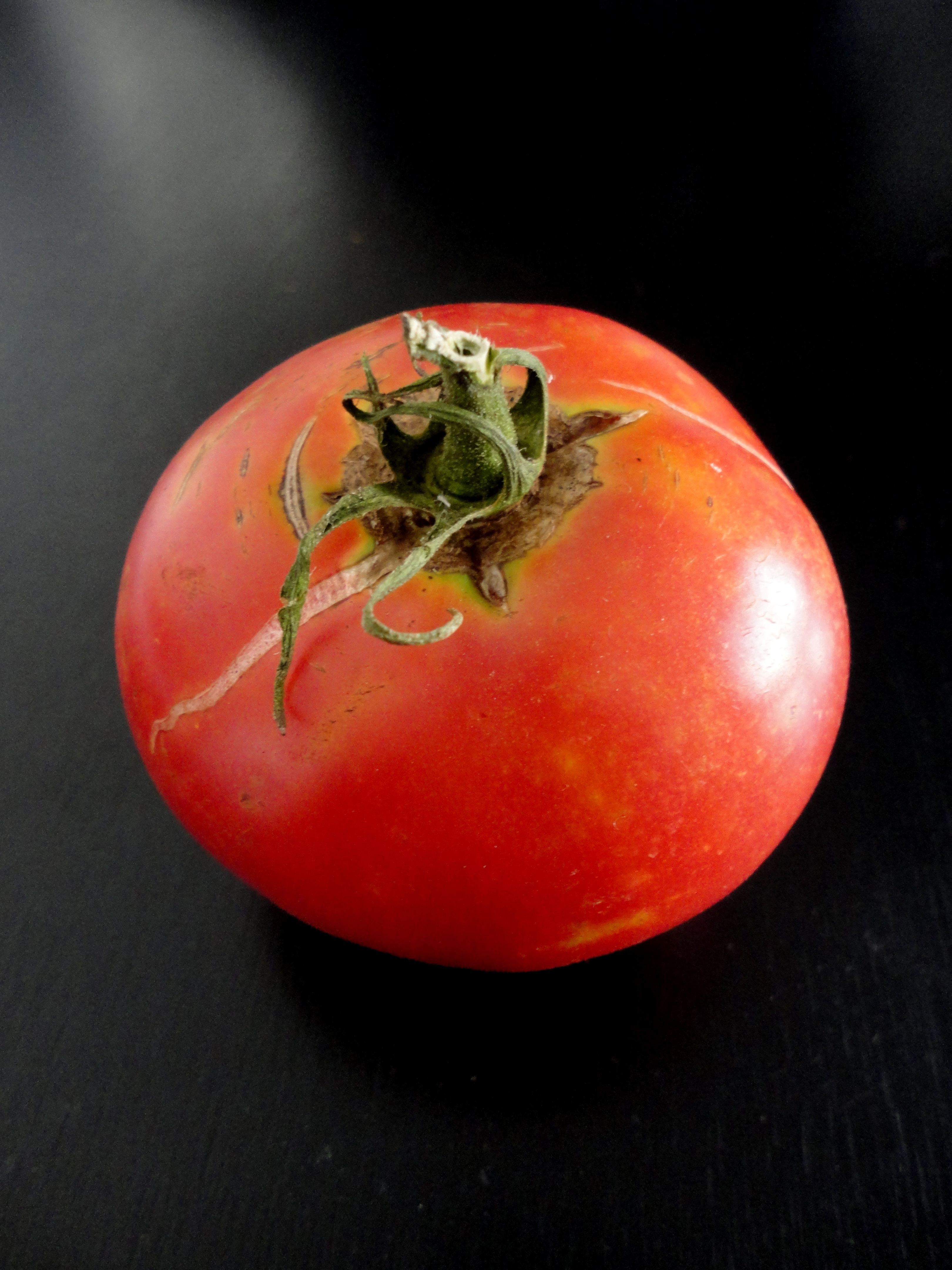 I never thought we’d get here, but here we are at the night of the first tomato. I picked this baby yesterday, that nice red jewel in yesterday’s post. Of course, one cannot say that one grew this tomato entirely herself as it was the size of a marble when we purchased this plant. This does not deter me from crowing.