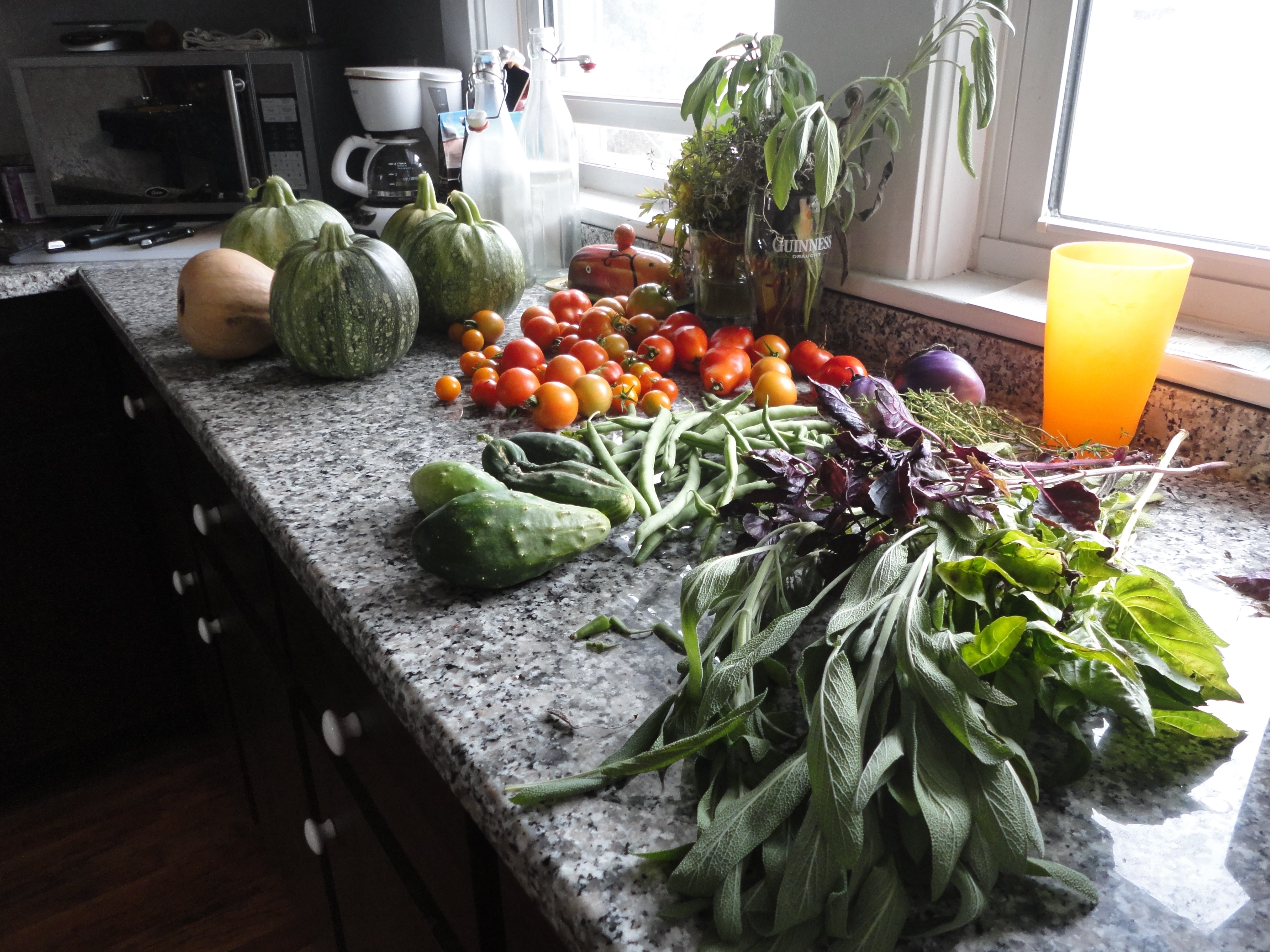 I was impressed with the way our produce spread across the entire kitchen counter. If it doesn’t look like much to you, just figure that half the green beans and a third of the tomatoes were in my stomach at time of photo.