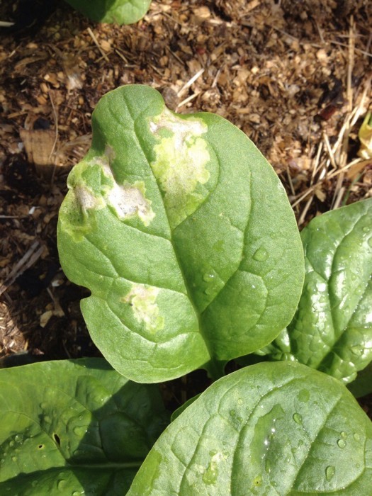 Our spinach is coming up and it looks all right, except for the leaf miner spots.