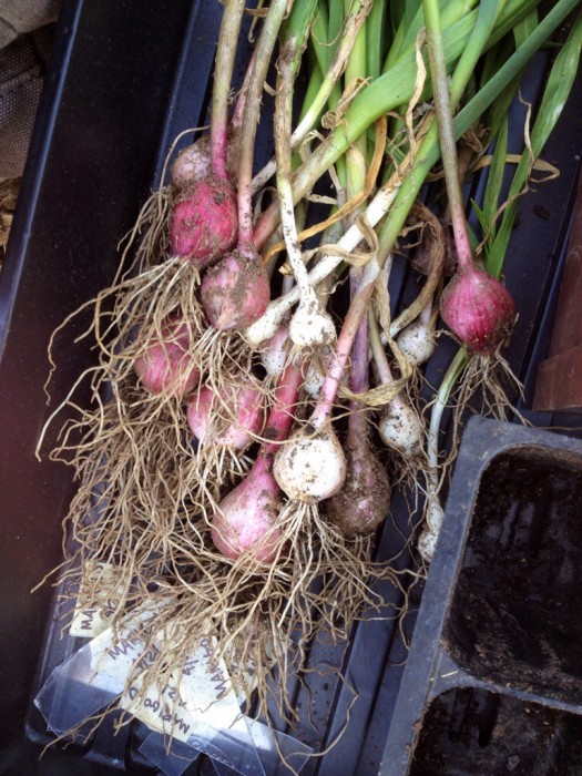 It looks nice and neat when you’re in the garden, all those little red caps in a row. We set out 12 tomato plants total this year, cutting back from last year’s 35 — we’ll make up the difference with tomatoes from Seth’s work. We also put in 5 eggplants, and pulled up enough spring garlic to last for a few weeks.