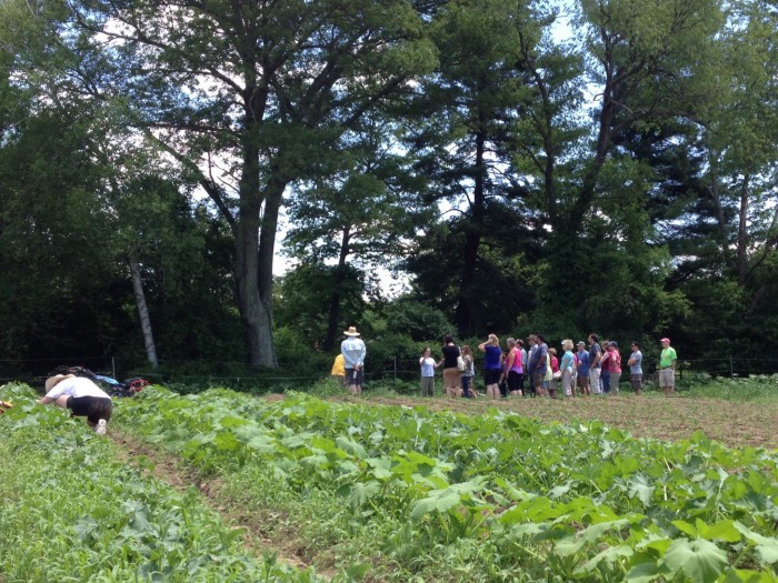 I don’t know if she was uncomfortably warm or glad to have me around, but the dog shadowed me for most of the day. I spent the morning hand-weeding the cucumbers and squash with a couple of volunteers. Lily hunkered down in the paths until the farm manager came by with a tour group of this season’s new CSA sharers. Then it was off to greet people.