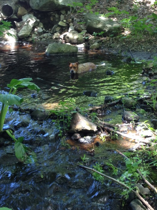 Lily and I took a long break at lunch. While the others went back to mulching the paths between the tomato beds and weeding, I took Lily to the stream that runs along the farm’s perimeter.