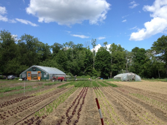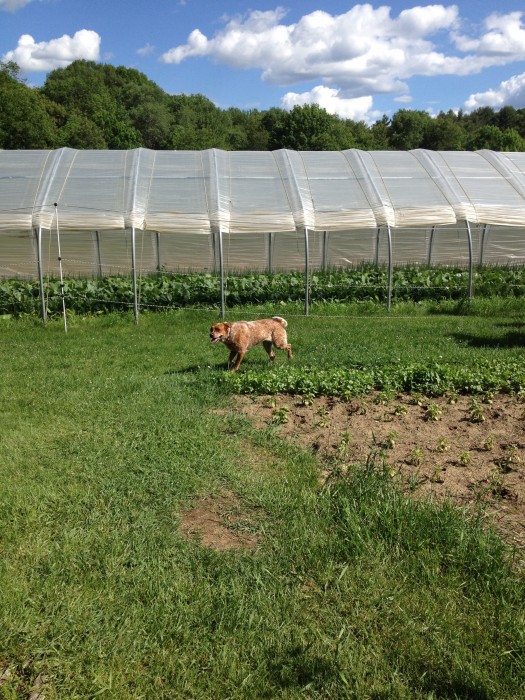 It was another bright, sunny day this weekend, and well into the 80s (that’s high 20s if you’re not in the US). The farm is prepping for the first week of CSA pickups. The lettuces are ready to pop, and you can see Kenneth harvesting Napa cabbages in the greenhouse on the right. It was a beautiful day. The only one to complain was the dog.