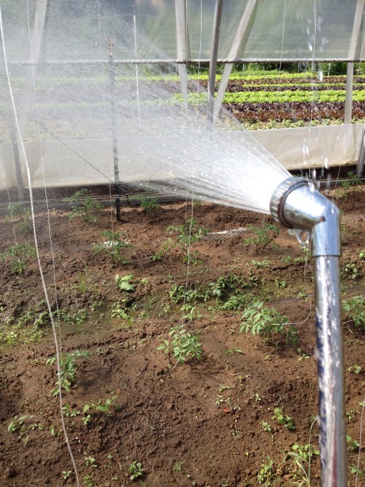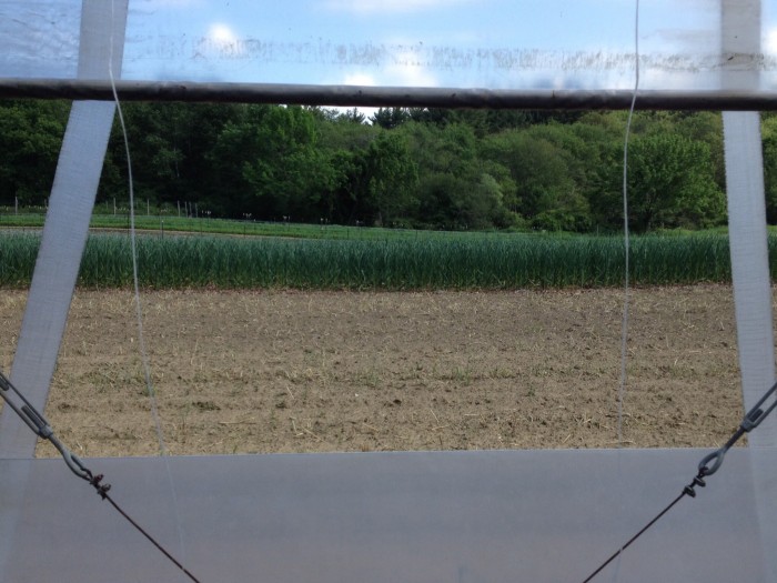 I like watering the greenhouse because it feels insulated from everything else. Sounds are muted through the plastic walls, the sprinkler head leaks so the water runs down your arms and cools you off, and there’s a breeze through the open doors and sides. If you look out one way you can see the lettuces in their neon glory, and through the other is the field of lusty garlic.