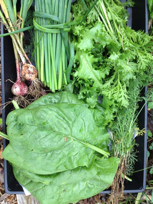 We got a nice little harvest of endive, peas, garlic, chives, a few onions, and our next door gardener contributed some herbs from his plot. I know you see spinach there, but I tossed most of it after watching a leaf miner wiggle its way around the leaf at breakfast the next morning. Doesn’t seem to deter my plants though. When I went back to the garden the next morning, the spinach sent up 4″ shoots overnight! Looks like it’s thinking of bolting.