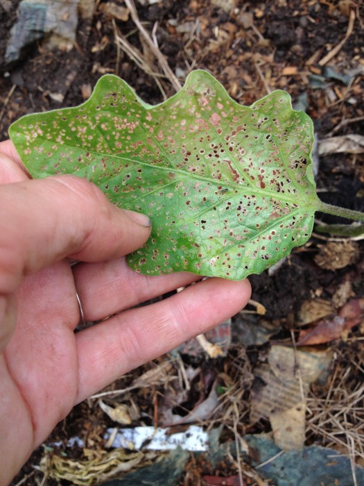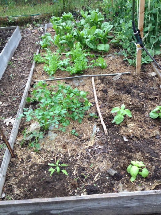 I can’t figure out what’s going on with the eggplant. Maybe flea beetles? I’m sure they’re being attacked because they are young and tender and… er… beautiful. Row cover probably would have helped, but I didn’t get my act together in time.