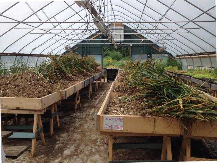 The garlic will dry for awhile in the greenhouse, mounded up on the planting tables. Then the farm crew will lop off the dry tops and transfer the bulbs to the root cellar. The darkness will keep them from sprouting. When it’s time for CSA members to pick up their shares, Stearns will give them about half of the harvest, and keep the rest for next year’s crop. The beauty of the farm at work, friends.