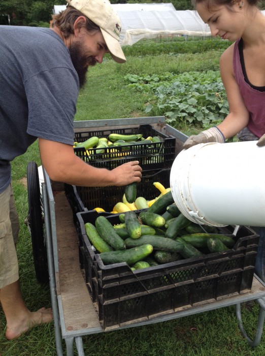 Meanwhile, It’s high July which means zucchini, squash, and cucumbers are dying to grow into baseball bats. Though the farm was closed, Seth, another volunteer, and I went in today to pick any curcurbits that were thinking about taking off over the next two days. This way when the farmers get back to work on Tuesday they aren’t confronted with Monster Zucchini or Patty Pan of Doom.