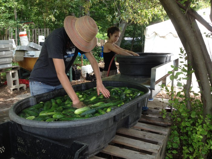 Once we were through with the broccoli, we spent our last hour before lunch harvesting and then washing squash, zucchini, and cucumbers. The farmers say that harvesting is an every day chore this time of the year, and I don’t blame them. Leave them on the vine overnight and it’s like each zucchini has an aspiration to become a 2×4. That there is 90 lbs. of cucumbers at the lovely, shady washing station.