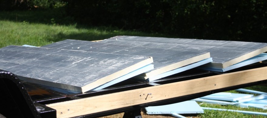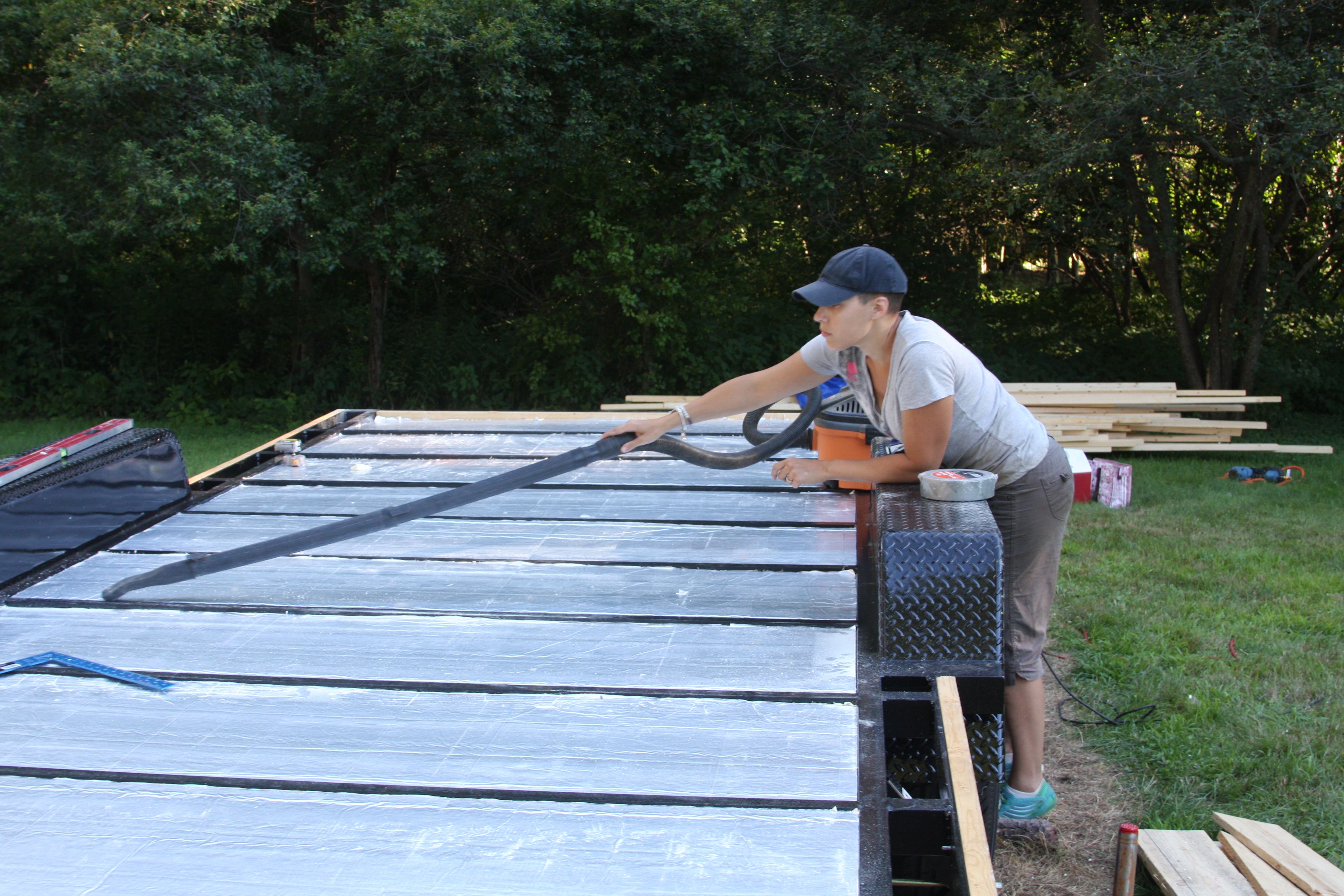 After cutting the insulation to size and fitting it into the bays between the trailer cross beams, we cleaned up so we could break out the plywood sub-floor.