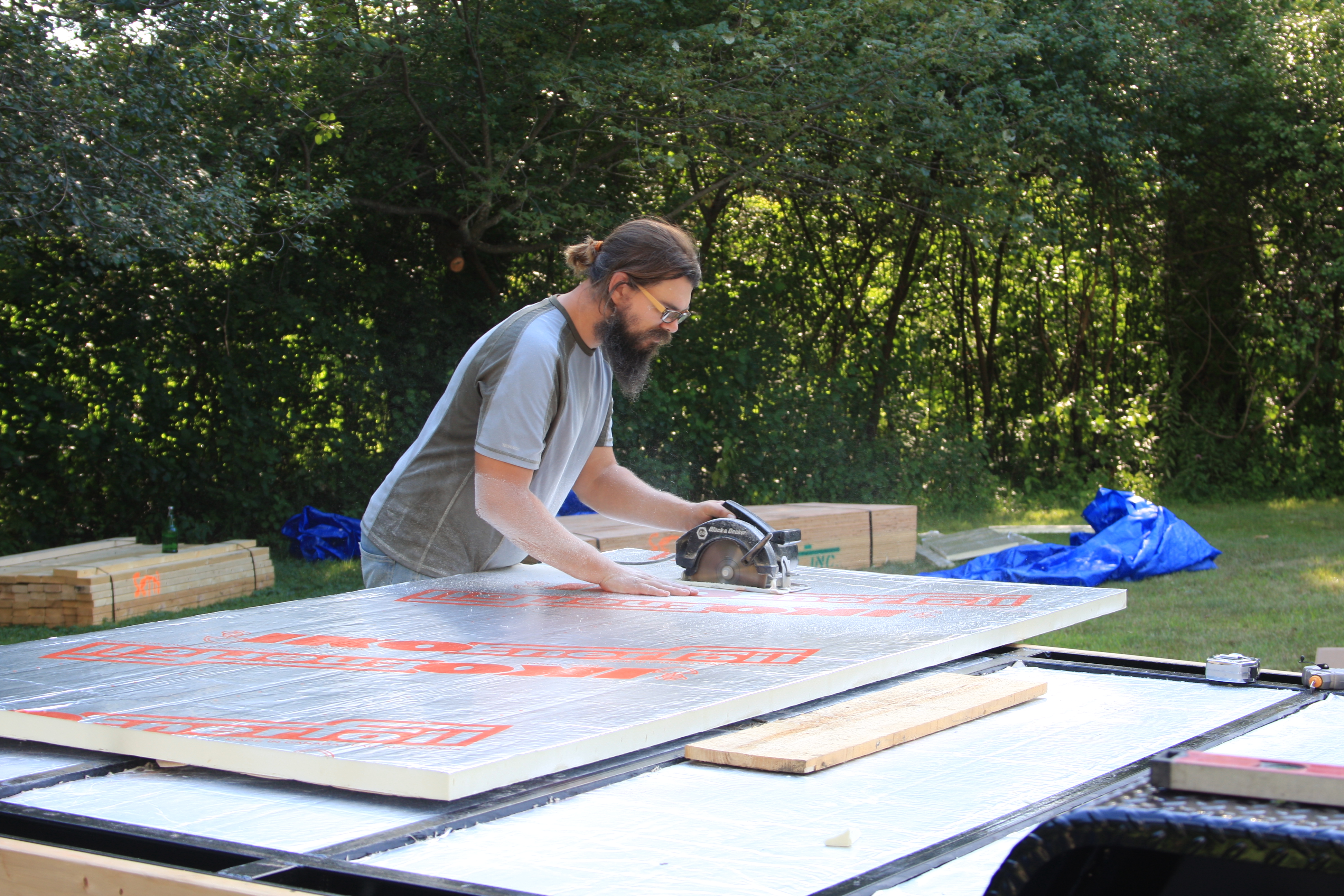 We were able to cut the polyiso insulation with a circular saw, but we cut the xps insulation with an exacto knife. This is one of life’s small favors. If you’re cutting xps insulation with a circular saw, please wear a mask. Xps is treated with fire retardants which are dangerous when inhaled. Polyiso isn’t treated with anything, although the dust still gets everywhere.