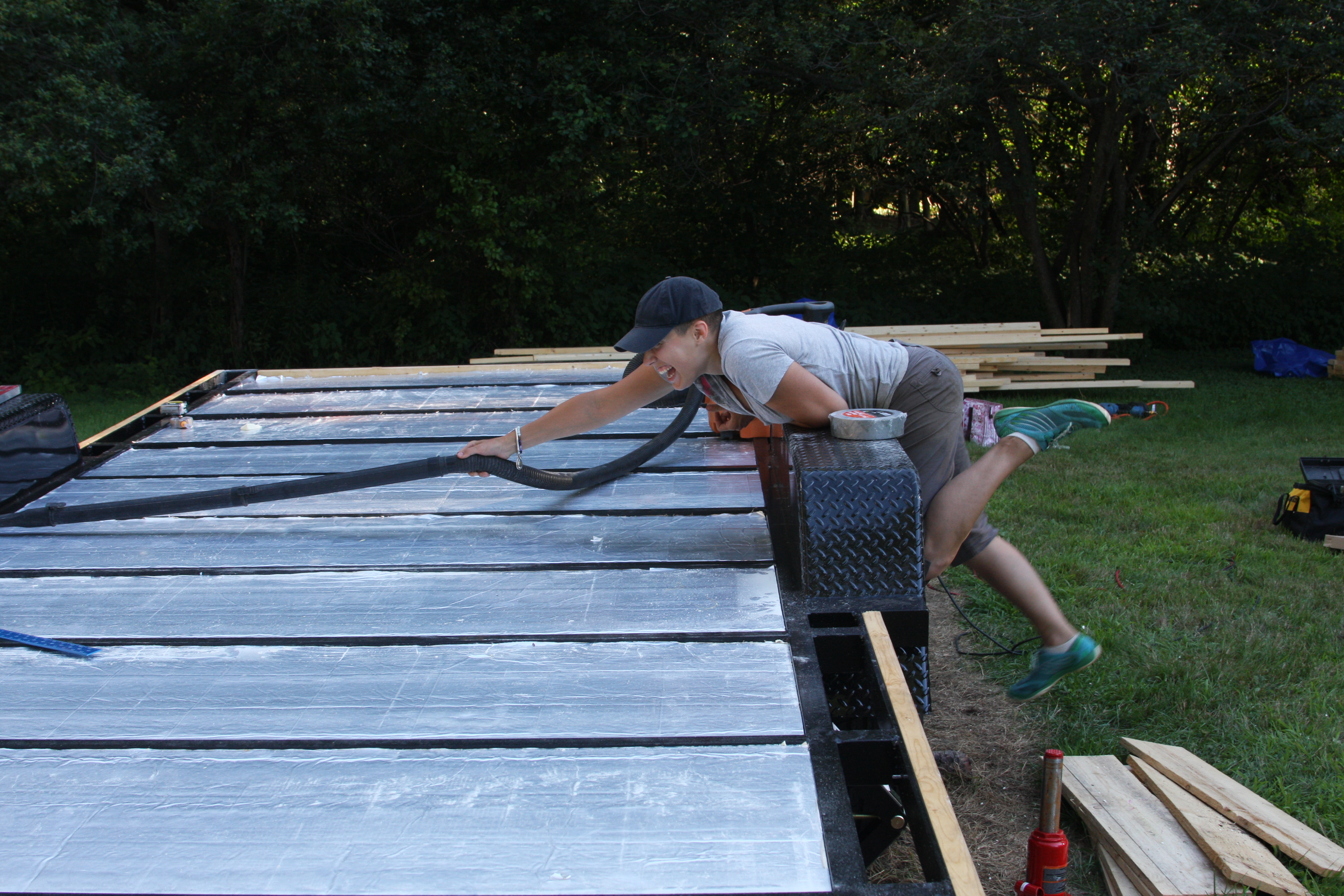 We chose to go with 1″ of xps insulation, and 1.5″ of polyiso insulation. In the best of all possible worlds, this will give us a floor with an r-value of 16.5 in our flooring. You see, xps works better in cold weather than hot, but polyiso is the opposite. Polyiso works worse in cold weather because the gas that’s trapped in the air spaces in the foam condenses into a liquid in 20 degree or lower temperatures, negating the r-value. The trick to using polyiso is that it has to be insulated from cold air. We accomplished this by placing the xps into the trailer first, then laying the polyiso on top of that.