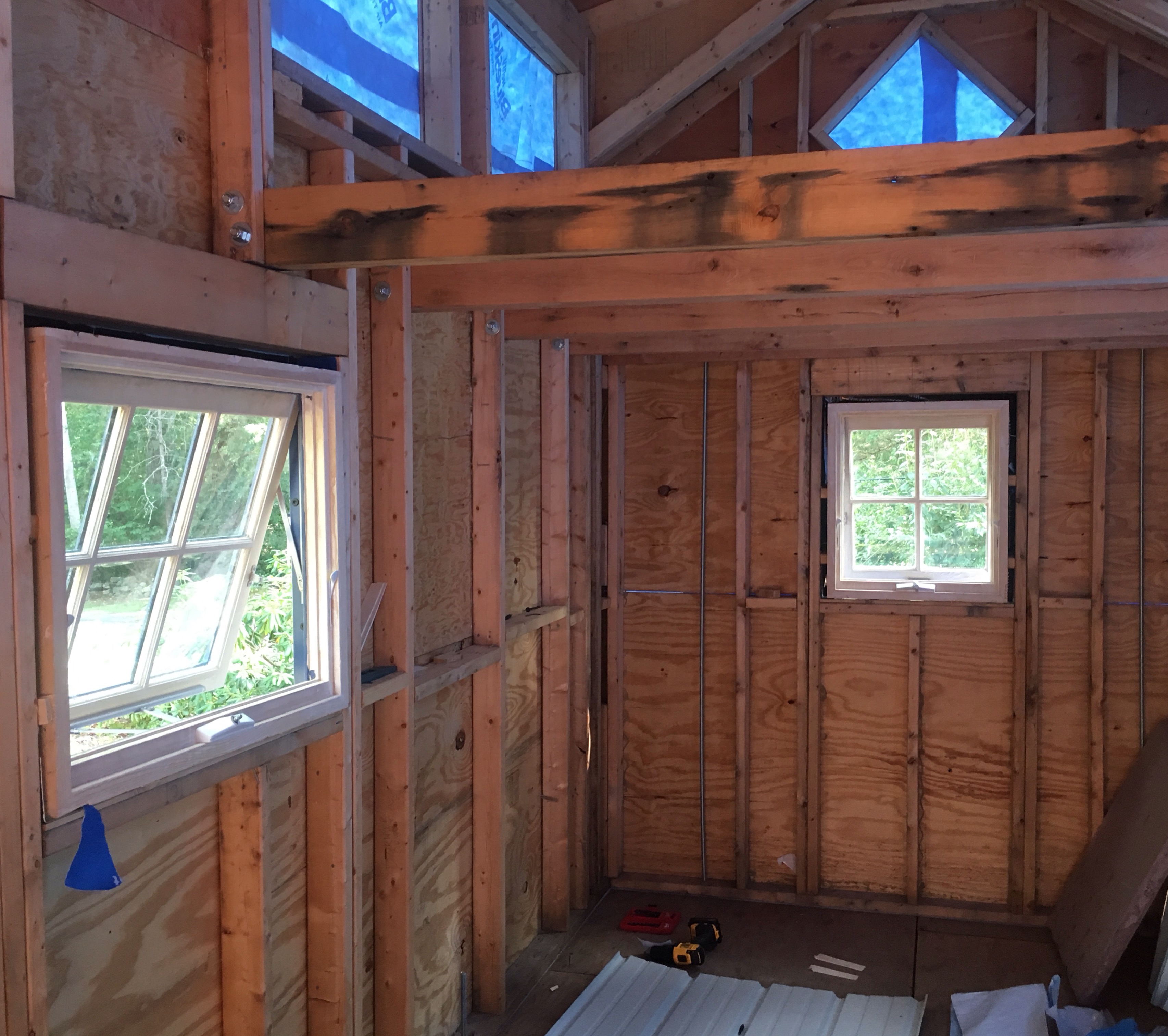 It was a process to figure out. We had to figure out how many attachments we needed, where they would sit that wouldn’t interfere with windows and yet still give us a rod every 6′ (as per building code), special order the rods, cut them to length, drill through the bottom plate, drill through the trailer, drill through the top plate, thread the rod through all the holes, and tighten down the bolts at both ends. Meanwhile, our suppliers conspired against us by providing the wrong size rods for two locations, along with our bank account which cringed at having to run to the hardware store four times for the correct tools to account for the change in sizes in our long lead time rods, and our stupid jerk brains that suddenly couldn’t do basic geometry. Yes we did cut that rod too long, and that other one too short. Building a tiny house is hard! Who knew, eh?