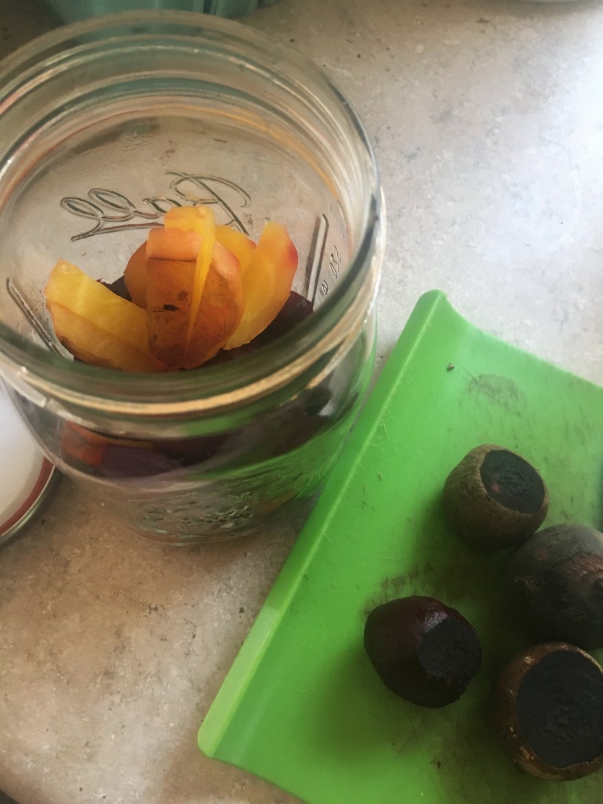 I got up some roasted beets too, which made their way into a jar for fridge pickles, which the baby also loves. Seth is the canner in our family, but there's no time this season for him, or for me to dive in and learn. Maybe if I had become proficient at it before the baby it wouldn't feel so daunting. I know the woman behind Food in Jars has no trouble whipping up small batches in the evenings so it's not impossible to do. But I've only got so much brainpower per day (I'm tired!), and knitting is a higher priority. I'll probably regret it this winter. But I'll regret it from within my warm, cozy sweater, so it's hard to feel remorseful here.