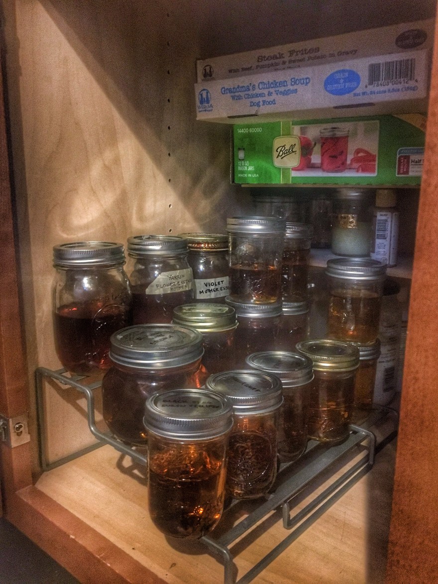 I made some space under the counter for all the herbals that will be going up for sale, and the supplies I use to make them. That's all of the essences, the herb bundles for smudging and smoke cleansing, and the little finishes I used on my daily card base. It's been interesting coming up with a storage method for the herbs. The dried flowers are fragile and can't be stacked. Right now it looks like trays are my best bet.